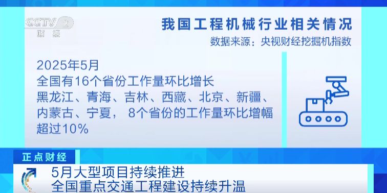 挖掘机是基础设施建设的“标配”,是反映、观察固定资产投资等经济变化的风向标。由央视财经打造的“央视财经挖掘机指数”今天发布了最新数据。数据显示,5月份,我国多个省份工程机械工作量持续增长,重点道路、桥梁等大型项目持续推进。