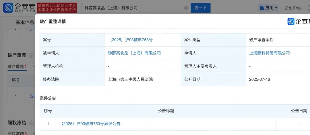 值得注意的是,此前钟薛高多家子公司已被申请破产审查。近日,钟薛高全资子公司即盘箸有喜(上海)生物科技有限公司被申请破产审查,经办法院为上海市第三中级人民法院。此前,钟薛高另一全资子公司即钟茂(上海)食品科技有限公司已被申请破产审查,申请人为上海安得列郎晴食品贸易有限公司。
