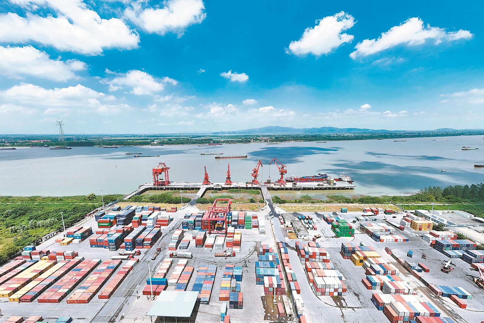 今年上半年,铜陵港口经济稳中向好,港口货物吞吐量、外贸进出口量、集装箱吞吐量增长显著。图为铜陵港长江外贸码头吊装设备正在进行集装箱装卸作业。本报通讯员储著传摄/视觉安徽