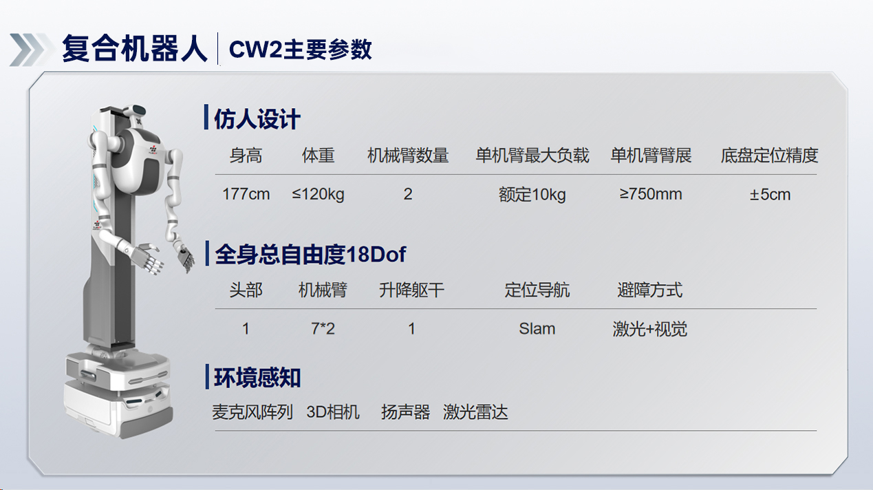 双臂可独立或协同作业,结合自主导航移动平台,实现空间自由度的跃升。集成语音交互、精准拾音、智能抓取与定位功能。这种高度集成与灵活性,使其在复杂工厂环境(跨工位物料配送、柔性装配线)、智能仓储(动态拣选、跨区搬运)、商业服务(酒店配送、餐厅传菜)乃至未来家庭服务等多元场景中展现出颠覆性潜力,为“无人化”和“柔性化”生产提供可扩展的解决方案。