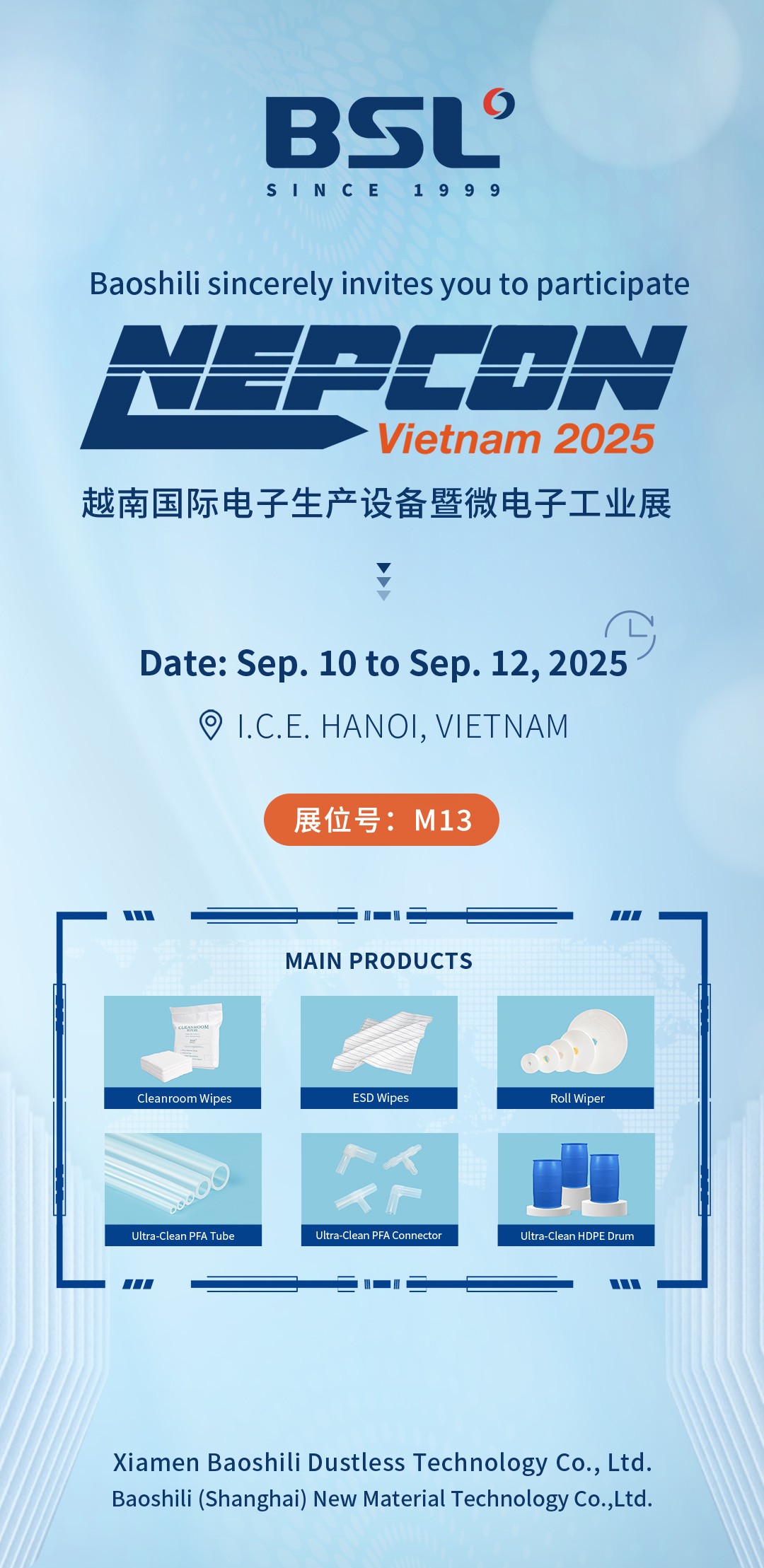 在全球电子产业高速发展的浪潮中,保视丽始终致力于为全球客户提供高标准、可靠的产品,包括聚酯纤维擦拭布、超细纤维擦拭布、防静电擦拭布、卷轴式擦拭布、超净PFA管、超净PFA接头和超净HDPE桶。在本届展会上,这些创新产品将悉数登场,精彩亮相: