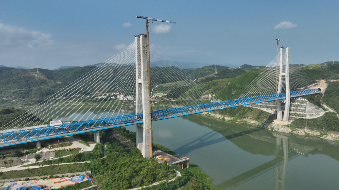 西十高铁汉江特大桥位于湖北省十堰市,设计主跨420米一跨飞越汉江,是西十高铁控制性工程。此次合龙的钢桁梁全长840米、宽11米、高9.4米,具有线形控制难度大、交叉施工作业多、吊装空间有限等特点。该桥采用的梁桁组合结构是一种新型桥梁结构形式,为国内首次在高速铁路斜拉桥上使用。