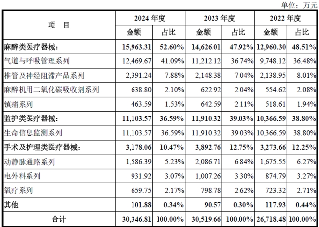 市场布局方面,海圣医疗已构建起以麻醉类和监护类产品为核心的业务结构,2024年两类产品收入占比分别达52.60%和36.59%,合计贡献近九成营收,核心产品集中度显著。终端覆盖上,公司已进入全国超600家三甲医院,包括北京协和医院、上海瑞金医院等知名医疗机构,经销商体系稳定。
