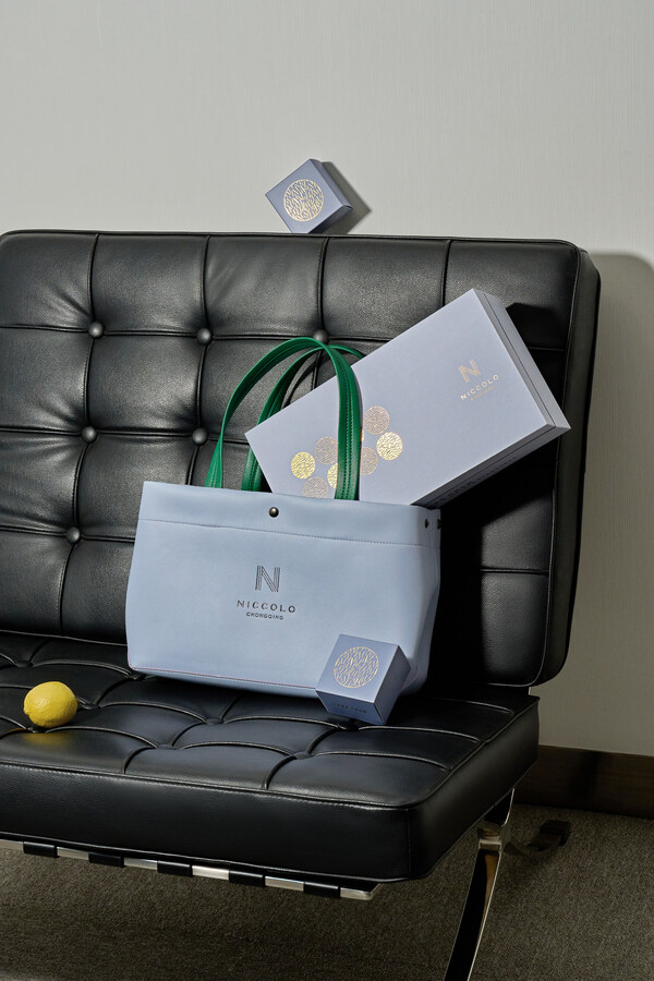 "摩登堇月"礼盒则采用皮革材质衬以压印工艺,包装选用奢华雅韵的紫色,灵感来源于日暮至月升的天际,礼盒上印有八枚以尼依格罗标志性艺术品"彩云朵朵"作设计元素的祥云图案,传递"等待团圆"的静谧期待也代表着与重庆尼依格罗酒店共度的八载光阴。整个礼盒俨然如一件潮流时尚单品,符合当代年轻受众的审美与喜好,且秉承可持续发展理念,之后亦可作日常挎包循环使用。