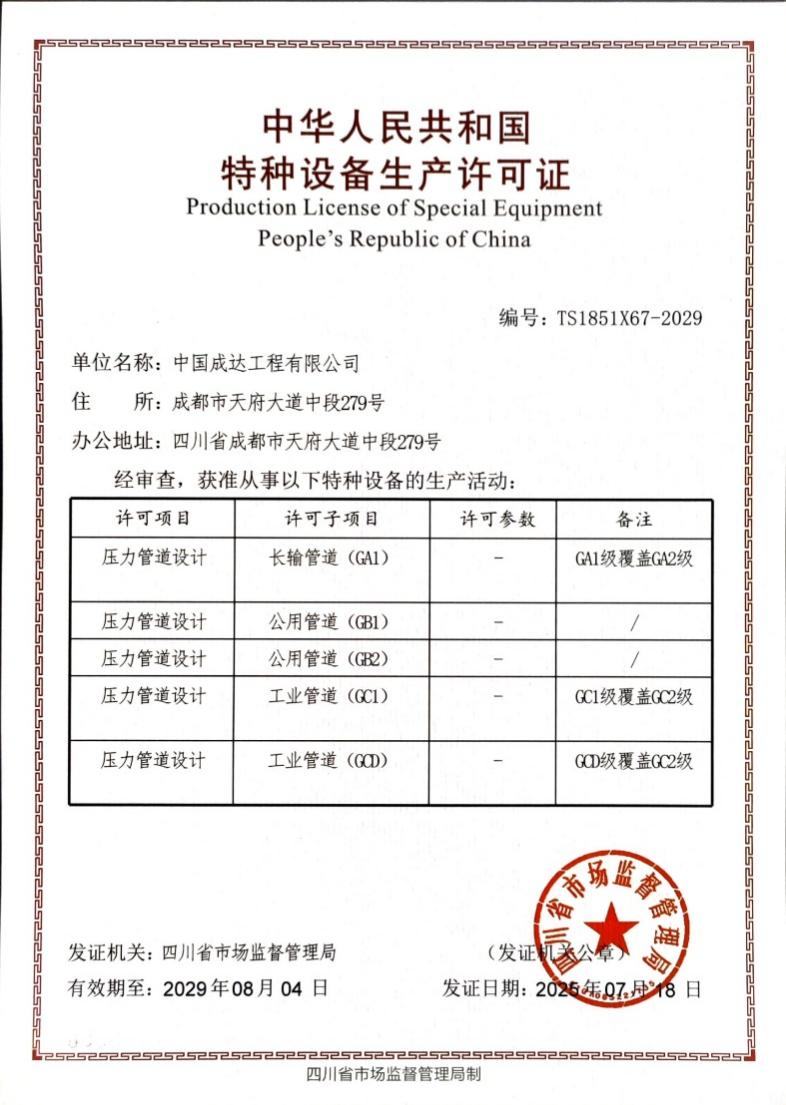近日,中国化学成达公司顺利通过成都市市场监督管理局审批,成功完成2025-2029年度压力管道设计许可换证,继续持有长输管道(GA1、GA2)、公用管道(GB1、GB2)、工业管道(GC1、GC2、GCD)等全部压力管道级别的设计许可资质。