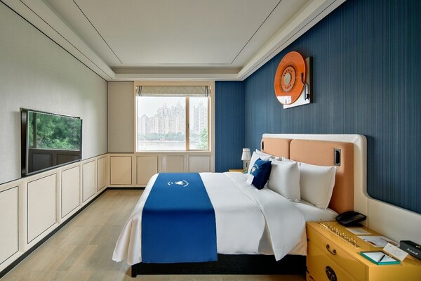 「钴蓝秘境」主题住房体验匠心独运,将英迪格标志性的靛蓝色调与俄皇LOMONOSOV经典钴蓝元素巧妙融合,通过精心设计的软装细节呈现两种蓝色的艺术对话。精心打造的主题套房中,不仅拥有舒适雅致的旅居空间,更可于专属阳台近览广州塔璀璨夜景与珠江旖旎风光,为宾客带来视觉与心灵的双重享受。