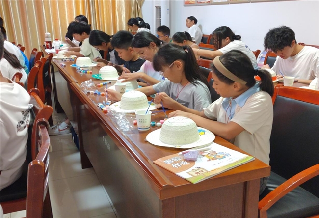 图为小朋友制作草帽涂鸦“活动照片张文熙/摄