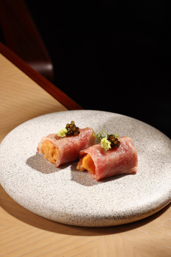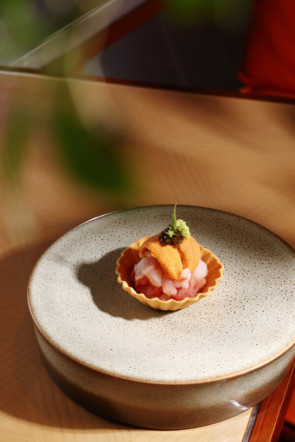 海胆和牛鱼籽酱塔塔-采用新鲜海胆、和牛薄片和鱼籽酱的三重组合,口感层次丰富。海胆的甜美、和牛的丰腴、鱼籽的微咸在口中交织,带来冰润爽滑的体验,每一口都像是海洋与陆地的味觉交响。