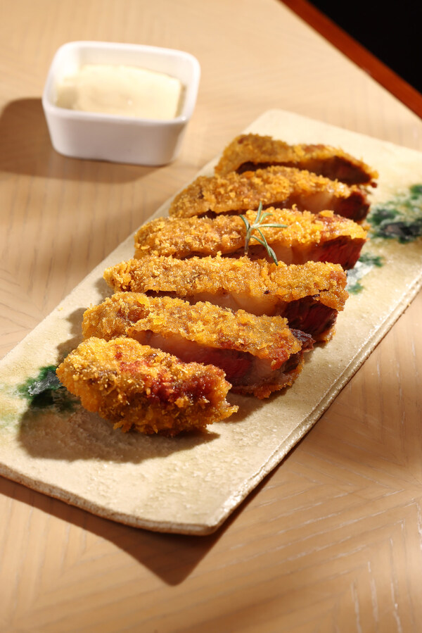 吉列和牛配塔塔酱-低温慢煮和牛裹上金黄脆皮,外酥里嫩。搭配酸香塔塔酱,轻轻一咬便发出咔嚓声,味蕾立即被脂香与酱香包围,满足感瞬间拉满。