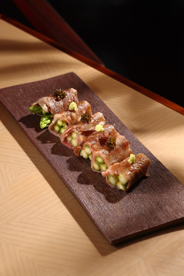 和牛芦笋卷-轻炙和牛片包裹脆嫩芦笋,肉汁渗入蔬菜纤维,口感丰富。牛肉的香浓与芦笋的清脆形成鲜明对比,每一口都像是在舌尖奏响交响曲。