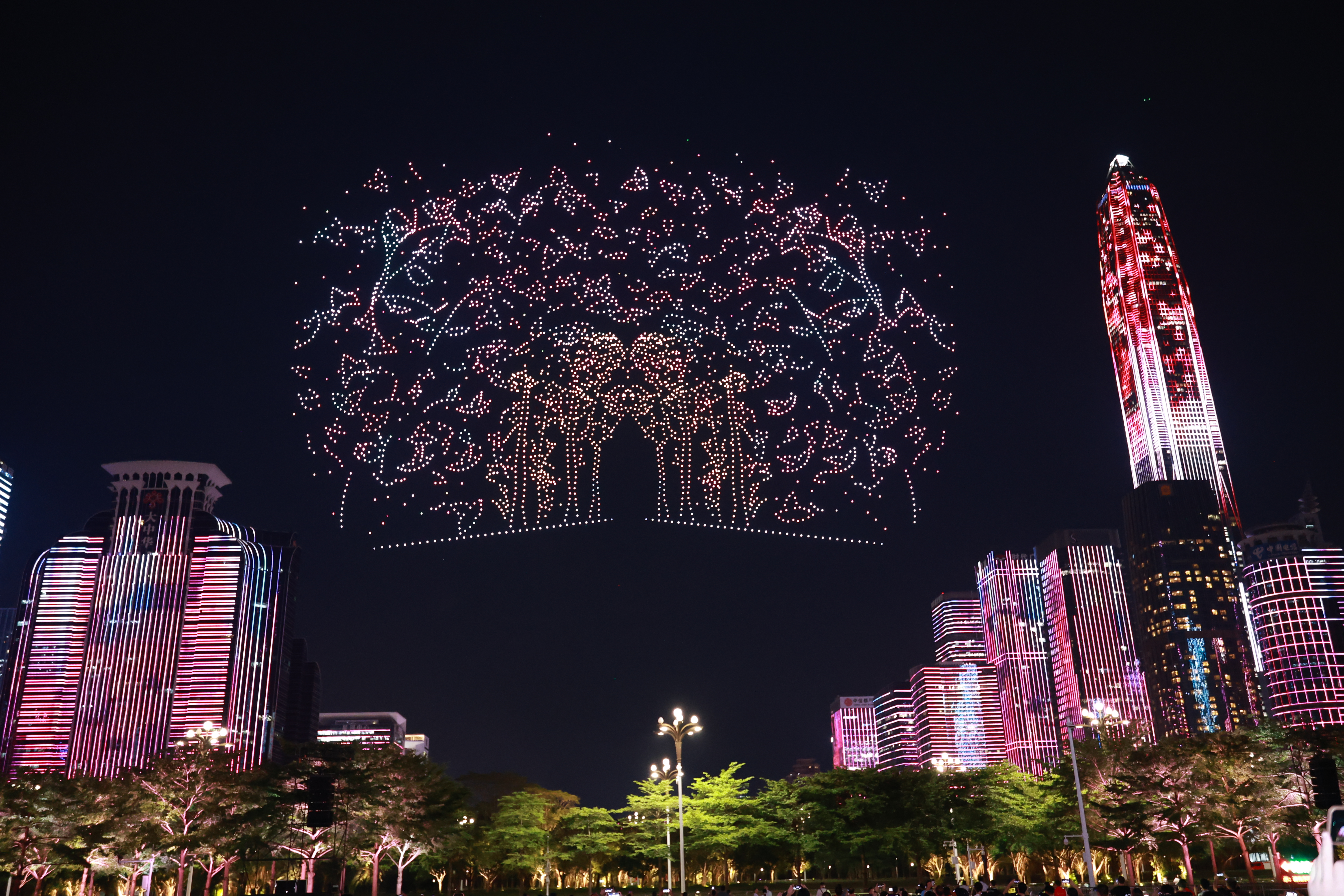 本次演出采用全球首创「1+2+N」模式,“1”即一城全景沸腾,深圳市各区、大鹏新区、深汕特别合作区和前海合作区地标同时点亮,共同勾勒特区发展长卷;“2”为双核梦幻主场,深圳市民广场、深圳人才公园不同篇章同步上演,以“梦幻联动”向城市致敬;“N”指全域光影漫游,深圳市16处灯光秀场与无人机编队实时联动同频共振,以整座城市为舞台,实现全民共享、近悦远来。