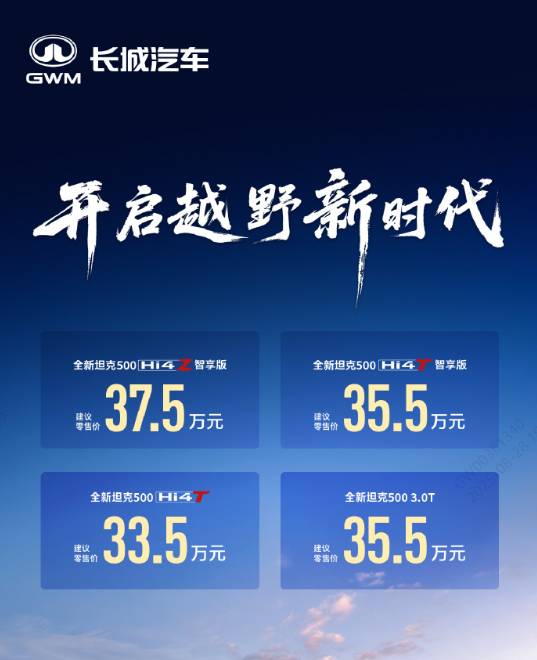 全新坦克500本次共推出Hi4-Z、Hi4-T智享版及Hi4-T与3.0T四个配置,售价33.5万元起。上市期订车权益丰厚:全新坦克500Hi4-Z、Hi4-T智享版用户可享价值41000元的配置权益及总价值38000元的5重限时豪礼,全新坦克5003.0T也可享受总价值26000元的豪礼权益。