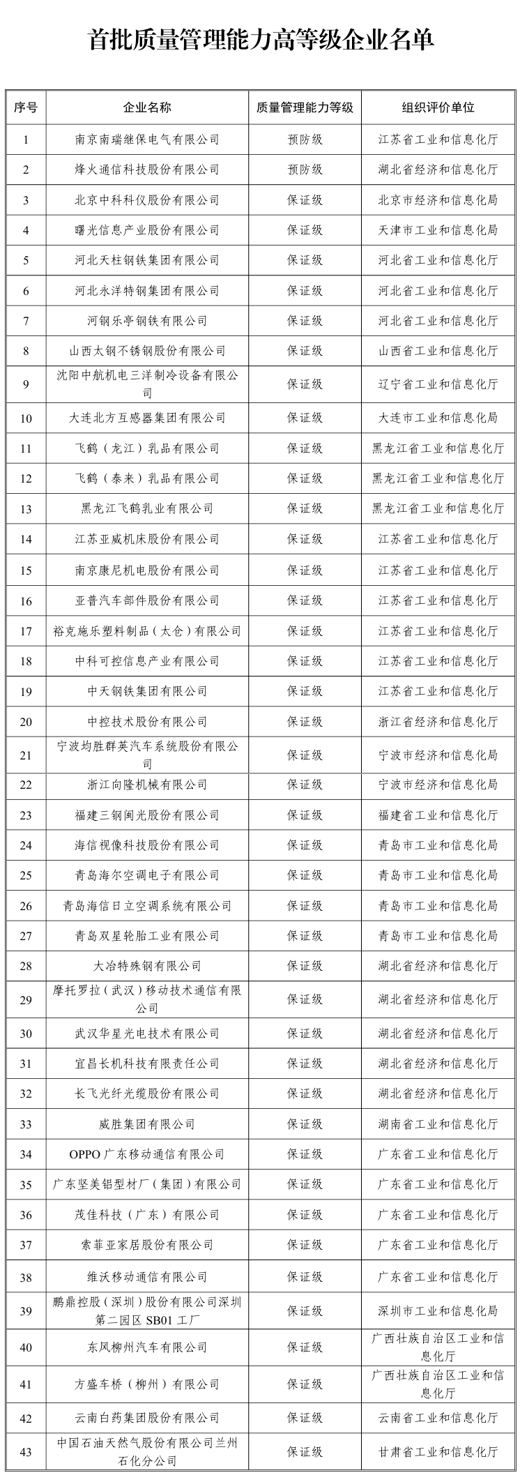 为落实《制造业卓越质量工程实施意见》(工信部联科〔2023〕249号)和《工业和信息化部办公厅关于开展2024年制造业企业质量管理能力评价工作的通知》(工信厅科函〔2024〕160号),经自评价、评价复核、二次复核、征求意见、社会公示,我部确定了首批43家质量管理能力高等级企业名单,现予以公布。
