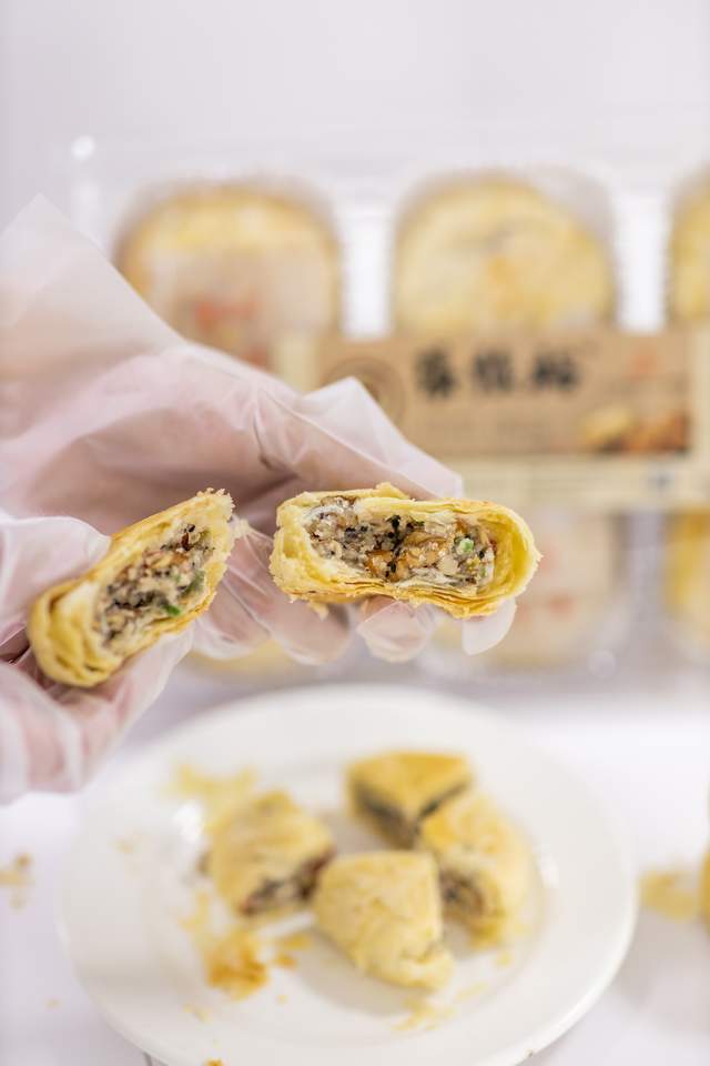 长泾茶食在明清江阴县志中屡有记载,月饼等传统苏式糕点以馅料丰富、口味上乘著称。“张慎裕”月饼作为代表,坚守手工制作传统,似执着工匠雕琢艺术品。其外观金黄油润、圆边浅黄、皮层酥松、色泽诱人;馅料用核桃仁、瓜子仁等精心配制,肥而不腻。制饼师傅“油糖面,随手变,三分做,七分烤”的秘诀,蕴含着几代人的智慧传承。经不断改良,饼皮层层起酥、薄如蝉翼,包裹丰富馅料,每一口都甜而不腻、口齿留香,那是地道老味道,是岁月沉淀的醇香,能让人穿越时空,回到温情旧时光。