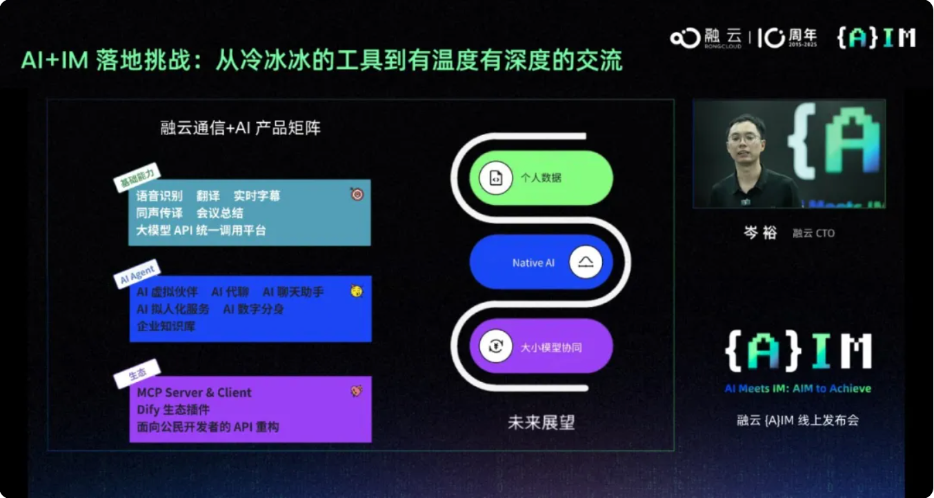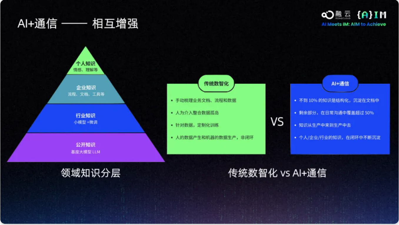 融云CTO岑裕在发布会上将大模型的本质归纳为“人类知识的压缩器”,但它更容易获取和依赖的是静态、公开的数据。而人类沟通中产生的海量实时、动态、带情境的知识,如行业经验、企业流程、个人洞察,却难以被消化。