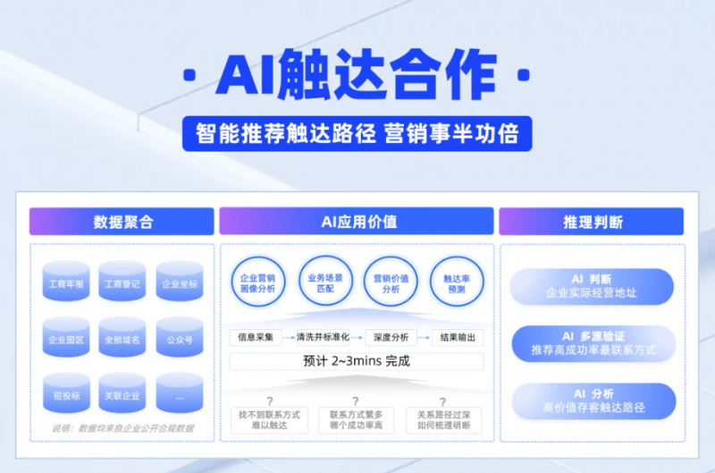 在构建完整触达链路后,「AI触达合作」功能可在2-3分钟内自动输出智能触达策略。一方面,基于信息时效性与可信度对联系方式进行AI优选,为企业推荐触达成功概率最高的方式;另一方面,根据关系紧密度对存客触达路径进行AI优选,大幅提升触达效率。最终输出的方案整合企业基本情况、实际经营地址、优选联系方式等信息,一站式解决企业营销中的“找不到、难筛选、难挖掘”等难题。