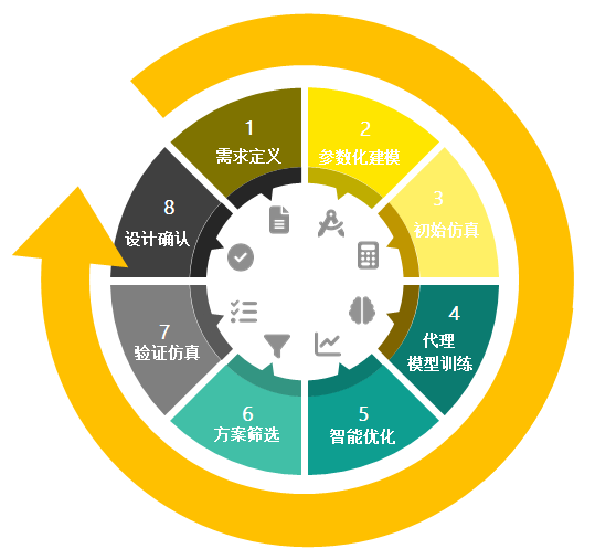 该方案的实施依托标准化的AI仿真研发流程:首先精准定义设计需求并构建参数化模型,随后通过自动仿真生成数据,训练高精度代理模型;进而利用AI优化算法高效探索设计空间,快速定位性能优异的候选方案;最终经过严格验证与确认完成设计。