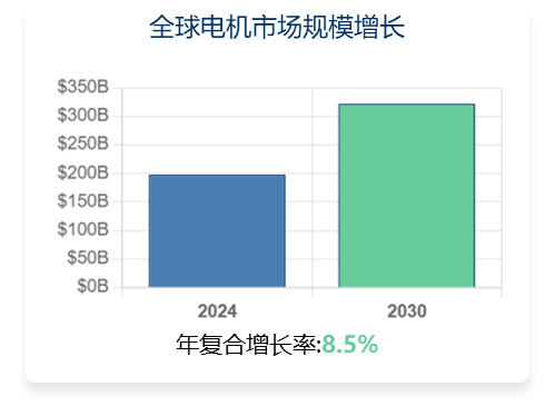 全球电机市场正迎来强劲增长,预计将从2024年的1978亿美元增长至2030年的3221亿美元,年复合增长率达到8.5%。这一增长主要由三大关键因素驱动: