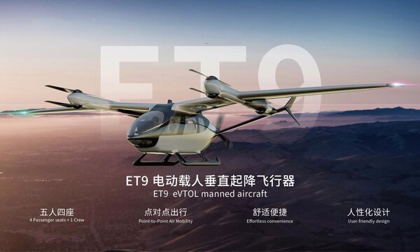 ET9电动载人机型:作为旗舰机型,凭借纯电动力系统和科技安全设计,提供点对点出行解决方案,高频使用,高航速,支持五人四座载重,适用于城市空中出行、紧急救援及特色旅游,结合人性化乘客舱智能交互,实现舒适便捷的三维立体出行体验。