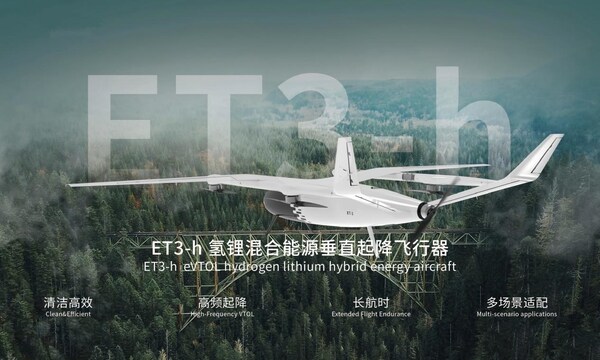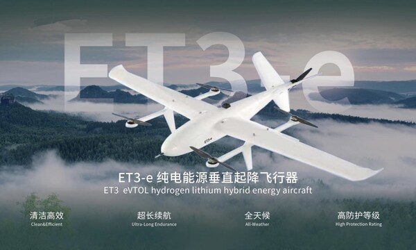 ET3-h氢锂混合版:结合清洁高效能源,高频起降适应性强,超长续航,全复合材料设计确保低维护成本,多场景适配电力巡检、边境监控等应用。