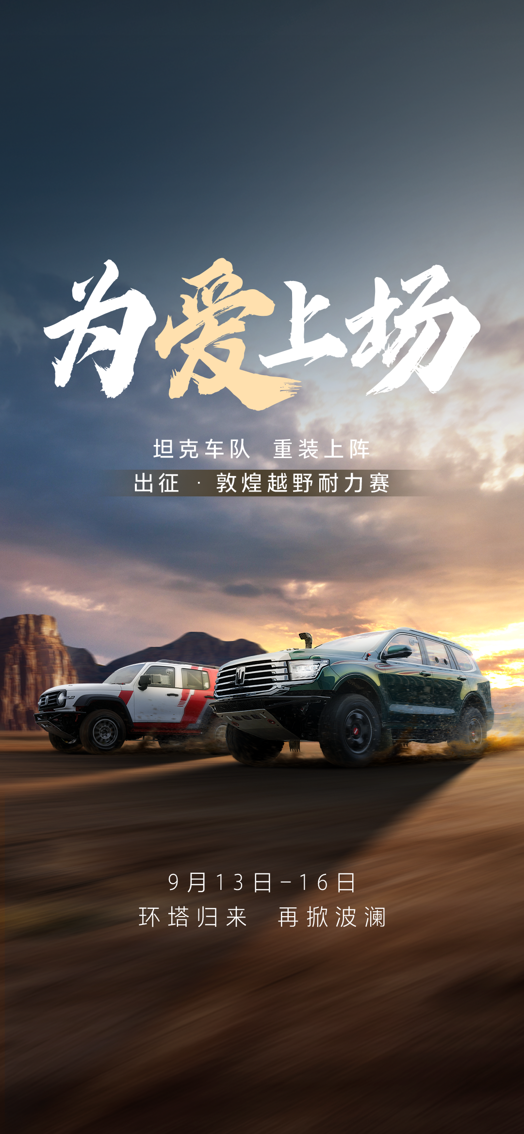 环塔硝烟方散,敦煌征途再启。“为热爱上场”的坦克将以强悍的实力迎接沙漠戈壁的挑战,以可靠品质守护每一份对越野的热爱和梦想。未来,坦克将继续秉持这份铁汉柔情的精神陪伴每一位勇敢的逐梦者,为越野爱好者打造更多值得信赖的越野座驾,与更多人一同奔赴山海、无畏前行。现在,让我们一起期待9月13日至16日,看冠军车手与坦克战车共舞千里荒漠,再一次,为中国越野写下热血与梦想交织的篇章!