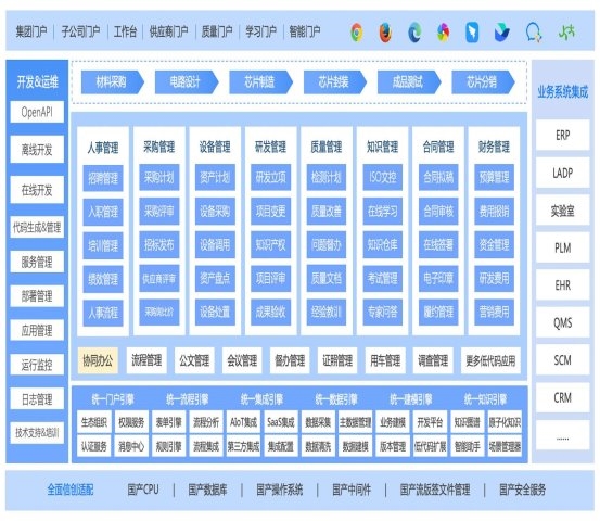 某半导体“小巨人”的OA+低代码实践也极具行业参考性。其一向注重信息化、数字化建设,构建了包括ERP、CRM在内的多套系统,但伴随着业务高速拓展,企业对IT与管理提出了更高的要求。于是,该企业基于蓝凌EKP平台+低代码能力,打造了业务可集成、流程可拉通、应用可拓展的一体化数智OA,并构建了流程管理、ERP集成、工作门户、移动办公等应用,助力企业全面提升经营管理水平。