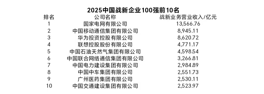 领跑动能更加强劲。“2025中国战略性新兴产业领军企业100强”的入围门槛为459.21亿元,提高64.07亿元;实现战新业务收入14.31万亿元,增长11.88%;资产总额达到22.41万亿元,增长20.29%。战新业务收入占比、利润占比分别达到40.23%、40.58%,分别提高2.99个百分点、0.43个百分点。位列前10位的企业是:国家电网有限公司、中国移动通信集团有限公司、华为投资控股有限公司、联想控股股份有限公司、中国石油天然气集团有限公司、中国联合网络通信集团有限公司、中国电力建设集团有限公司、中国中车集团有限公司、广州医药集团有限公司、中国交通建设集团有限公司。