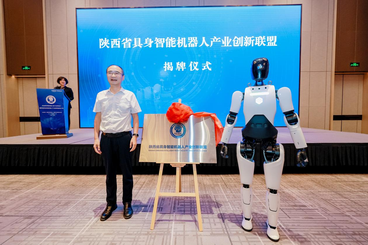 开幕式最受瞩目的“陕西省具身智能机器人产业创新联盟”揭牌仪式,以创新形式彰显陕西技术实力——由智莱特公司自主研发的人形机器人担任“特邀揭幕嘉宾”,与陕西经济联合会副会长王奋利共同完成揭牌。这一创新举措不仅展示了陕西的技术实力,也生动体现了具身智能技术从研发到应用的实际成果,赢得现场热烈反响。
