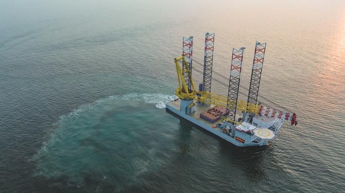 图为:启东中远海运海工建造的全球首艘3000吨级自升式风电安装船