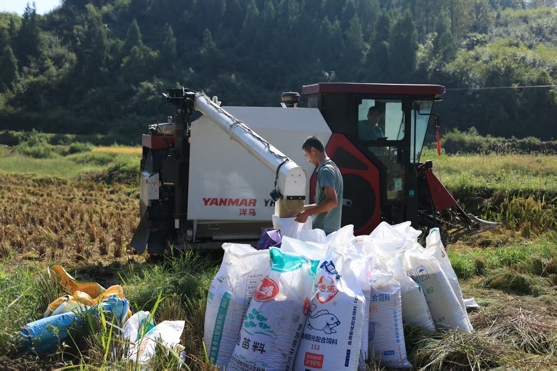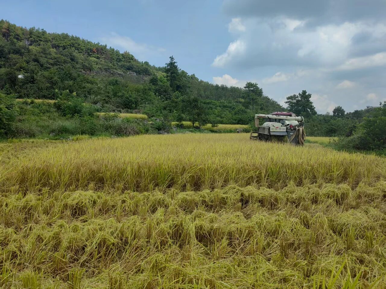 金秋时节,贵州省铜仁市万山区仁山街道开天村与塘边村的千亩稻田里,沉甸甸的稻穗随风摇曳,现代化收割机在田间来回穿梭,轰鸣声中,饱满的稻谷被快速收割、脱粒,金黄的谷粒倾泻入袋,空气中满是丰收的清甜气息。