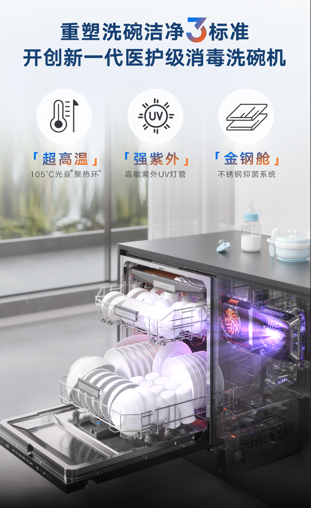 消毒,不再是附加功能,而是国人的健康底线,也是洗碗机能否扎根中国厨房的试金石。中式餐具形态各异、油污顽固难除,普通洗碗机往往力不从心。老板电器2025年全线升级消毒洗碗机,创新发明“光焱消毒科技”,从超高温、强紫外、金钢舱三个维度构建“真消毒才算洗干净”的洁净新标准;105℃超高温冲刷溶解重油污,500倍强度紫外线全域照射杀灭常见病原体,结合耐高温金钢舱不锈钢内胆实现持续抑菌。