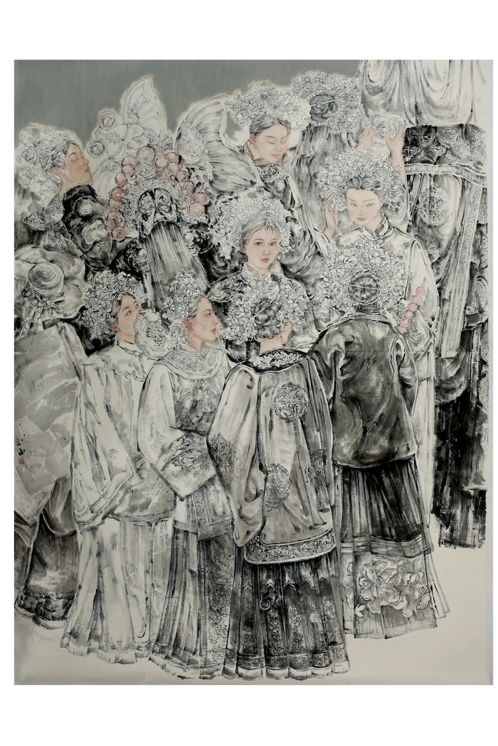 中央民族大学艾圣峰、瞿友祥、曹俊一、石琳创作,在舞蹈学院副教授苏娅菲老师指导下完成的数字影像舞蹈作品《攀》,以"攀登"姿态探讨生命自由,内涵深刻。全国铜奖暨最佳传统美术奖作品《鬓边春影》由山东师范大学宋小雨创作,在美术学院李民教授指导下完成。该作品以国画形式生动刻画了当代生活中的簪花人群像,巧妙连接起传统习俗与当下审美。创作者通过精妙驾驭水墨的黑白灰层次,既细腻呈现出人物服饰的纹理质感,也映衬出簪花头饰的璀璨光泽。画中人物神态温婉庄重,细节刻画入微,不仅止于视觉之美,更深度唤醒了簪花习俗所承载的文化记忆与情感内涵。