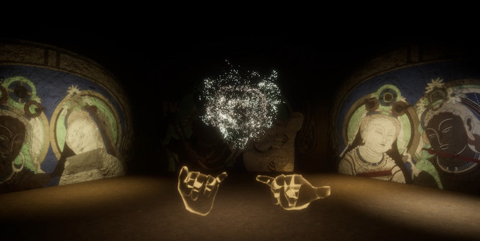 本届大赛涌现出多部将数字技术与传统文化深度交融的杰出作品。由清华大学美术学院段怡杉、倪嘉潞、董筱菍共同创作,在博士生导师、交互媒体艺术设计研究所所长张烈教授等老师指导下完成的《共演龟兹》,荣膺至尊大奖及最佳数字交互奖。该作品以克孜尔第38窟天宫伎乐图为蓝本,构建了观众可参与共创的数字化伎乐空间。