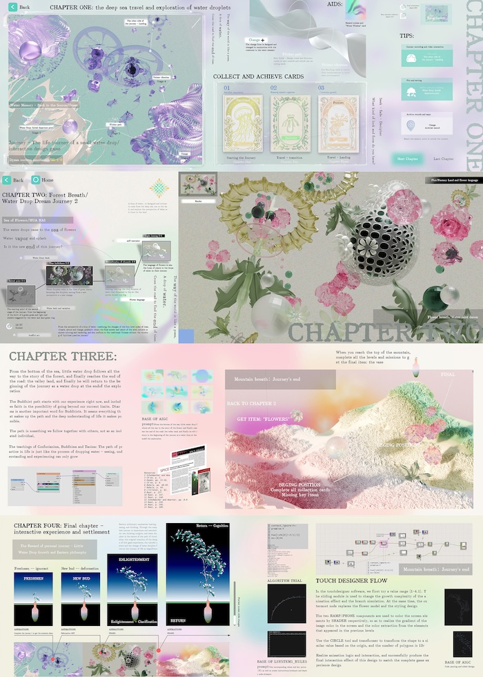 清华大学胡鑫洋、李甜、冀天扬、李建文创作,在清华大学美术学院原院长、博士生导师鲁晓波教授指导下完成的《艺术疗愈·一颗水滴的旅程》荣获全国金奖。作品以水滴旅程隐喻生命成长,触发深刻情感共鸣。