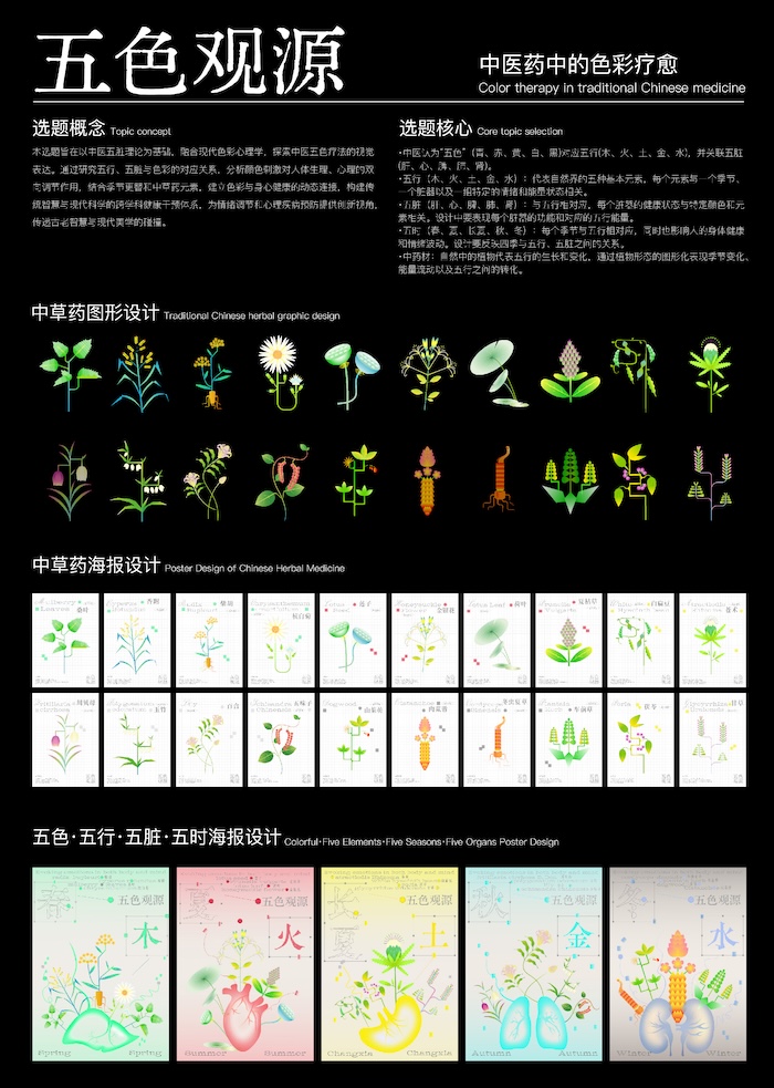 山东工艺美术学院李瑄玥、宋欣盈、杨珂、郑雯婷创作,在视觉传达设计学院副院长张培源教授指导下完成的《五色观源》,对中华传统"五色观"体系进行了系统视觉解码,同样斩获全国金奖。