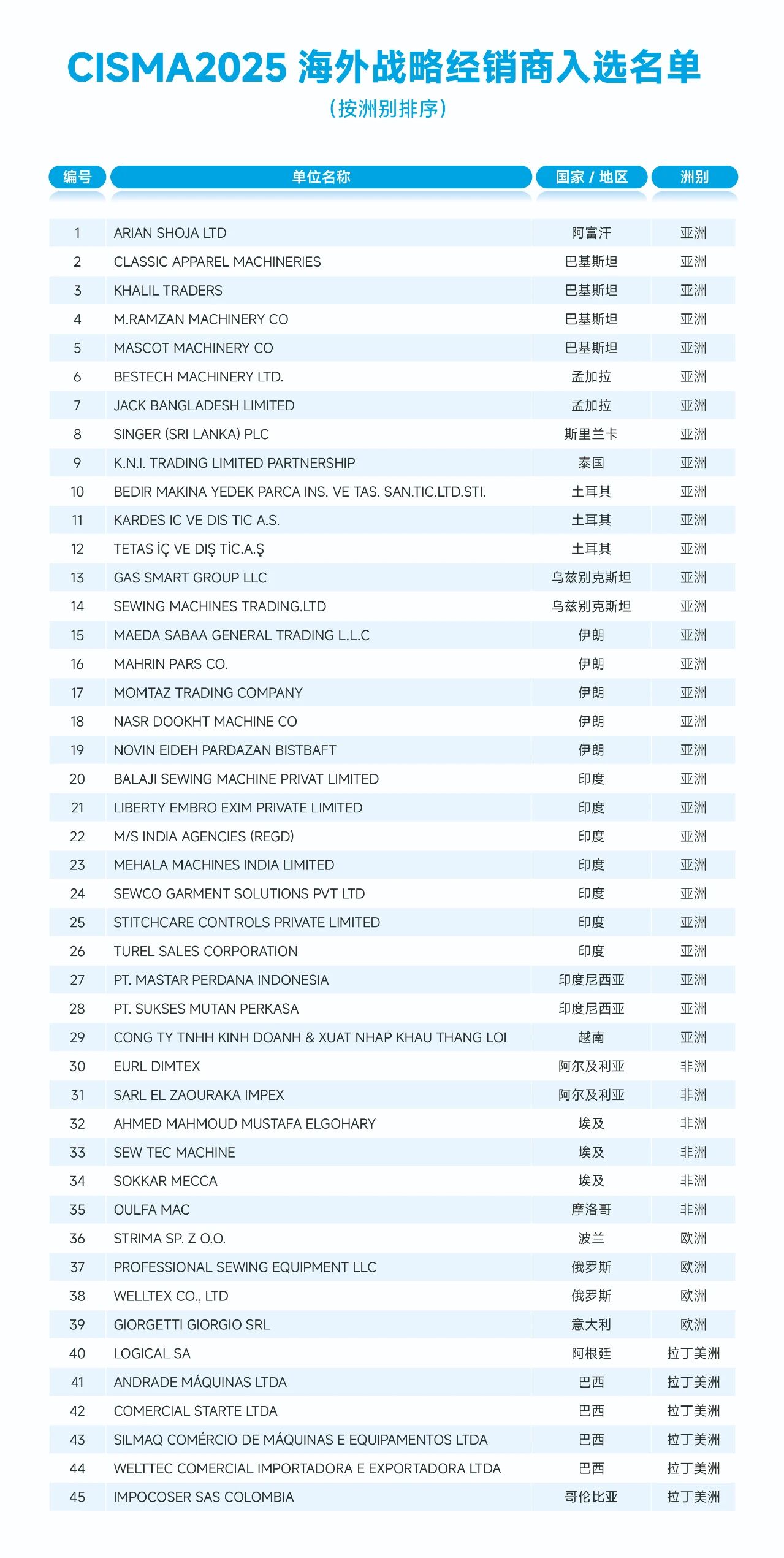 9月24日下午,海外战略经销商发布仪式在上海新国际博览中心N2馆论坛区举行。中国缝制机械协会理事长、协会市场工作委员会主任杨晓京,副理事长、市场工作委员会副主任吴吉灵,以及市场工作委员会相关副主任与行业骨干企业代表出席活动。来自五大洲20余个国家和地区的40余家海外经销商代表以及国内缝制机械生产、商贸领域的代表共100余人齐聚一堂,共同见证“CISMA2025海外战略经销商”名单的发布与表彰。