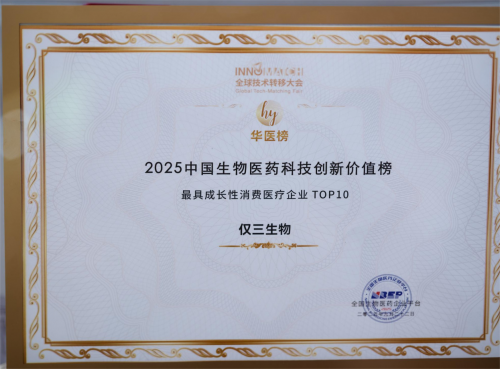 仅三生物荣获“2025中国生物医药科技创新价值榜最具成长性消费医疗企业TOP10”仅三生物供图