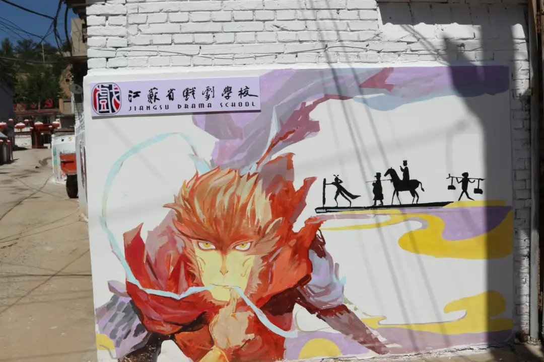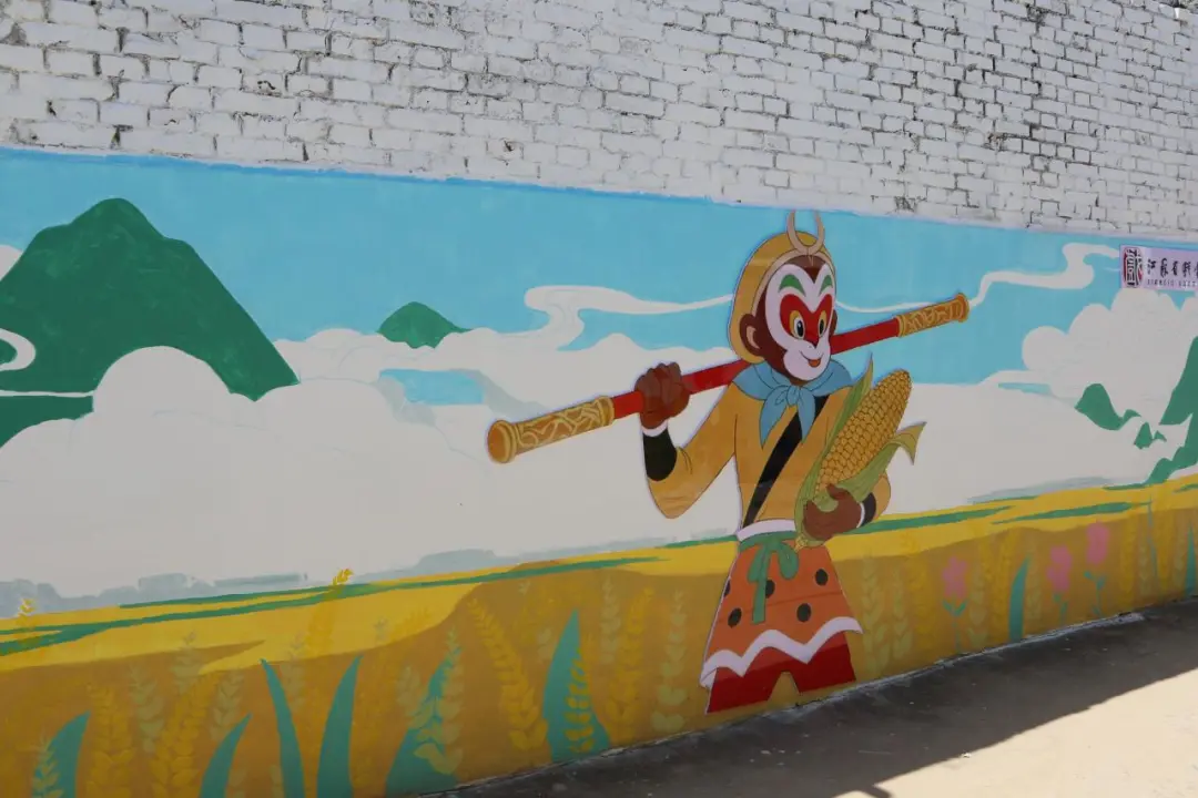 【大圣故里主题区】由江苏省戏剧学校师生创作完成,2025年8月,学校师生跨越1100余公里奔赴官庄村。娄烦县作为“大圣文化”的重要发源地之一,与江苏连云港花果山共承孙悟空文化脉络。师生团队巧妙融合两地文化元素,以“国风动漫+水墨丹青”的艺术手法,打造出具有高辨识度和传播力的西游文化景观。画面中既保留娄烦黄土高原的地貌纹理与农耕符号,又引入花果山的青绿山水色调和经典神话意象,创新塑造“农耕悟空”形象——肩扛金箍棒、手捧玉米,背景融入云顶山云雾与杂粮田景致,部分利用电线杆作“金箍棒”装置,增强神话氛围与互动感。创作团队不仅塑造了传统悟空形象,更创新融入现代“甜酷”风格,一系列生动可爱、兼具传统与时尚感的悟空形象深受孩子们喜爱,引来众多游客和村民打卡留念,成村里一道兼具文化内涵与网红效应的风景线。