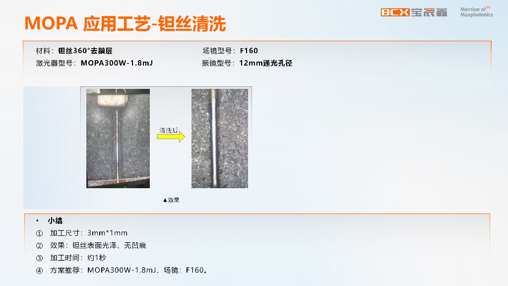 钽丝作为航空航天、真空镀膜、高端电容器等领域的关键特种材料,其氧化膜层清洗对精度要求极高。在此场景中,宝辰鑫采用搭载MOPA300W-1.8mJ激光源的小型化方案,清洗后钽丝表面光泽度良好,且无凹痕等损伤。作业数据显示,3mm×1mm尺寸的钽丝工件,清洗时间仅需1秒,推荐配置为MOPA300W-1.8mJ激光器+F160场镜。