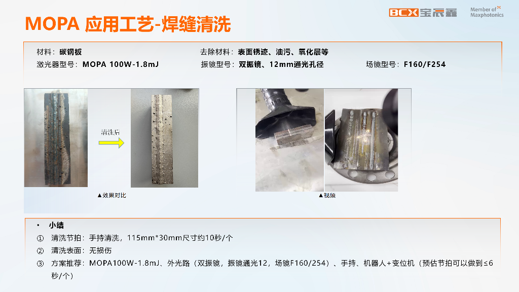 针对碳钢板焊缝清洗需求,该方案采用MOPA100W-1.8mJ激光器,配套12mm通光孔径双振镜、F160/F254场镜及手持清洗头。实际作业中,方案实现了无损伤清洗,有效去除了焊缝表面的锈迹、油污与氧化层。数据显示,对于115mm×30mm尺寸的工件,采用手持清洗方式时,单个工件清洗时间约10秒;若搭配机器人与变位机使用,预估清洗节拍可缩短至≤6秒/个,推荐配置为MOPA100W-1.8mJ激光器+双振镜(12mm通光)+F160/F254场镜。