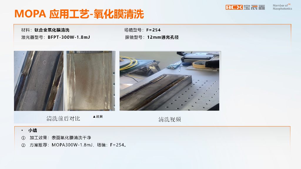 钛合金因机械性能优异、耐腐蚀性强,广泛应用于航空航天、医疗器械、海洋工程等领域,但表面氧化膜或油污会对后续焊接、镀层等工艺产生不利影响。该方案在钛合金氧化膜清洗中,核心光源仍采用MOPA300W-1.8mJ激光器,清洗过程无污染物产生,最终钛合金表面光亮如新,氧化膜清除彻底,推荐配置为MOPA300W-1.8mJ激光器+F254场镜。