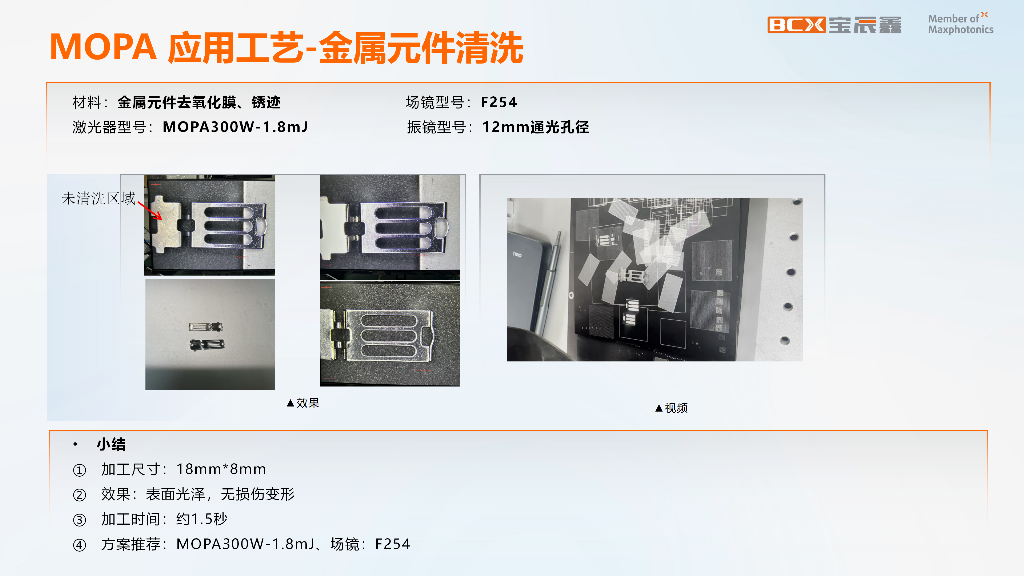 在金属不规则零部件、复杂表面及精细元件的清洗场景中,该方案的应用效果较为显著。据相关项目信息显示,宝辰鑫在某金属元件清洗任务中,采用了MOPA300W-1.8mJ激光器,搭配12mm通光孔径振镜与F254场镜,通过调整工艺参数后,成功去除了元件表面的氧化膜与锈迹,最终元件表面恢复光泽,且无任何损伤或变形。从作业数据来看,该任务加工尺寸为18mm×8mm,单工件加工时间约1.5秒,推荐配置为MOPA300W-1.8mJ激光器+F254场镜。