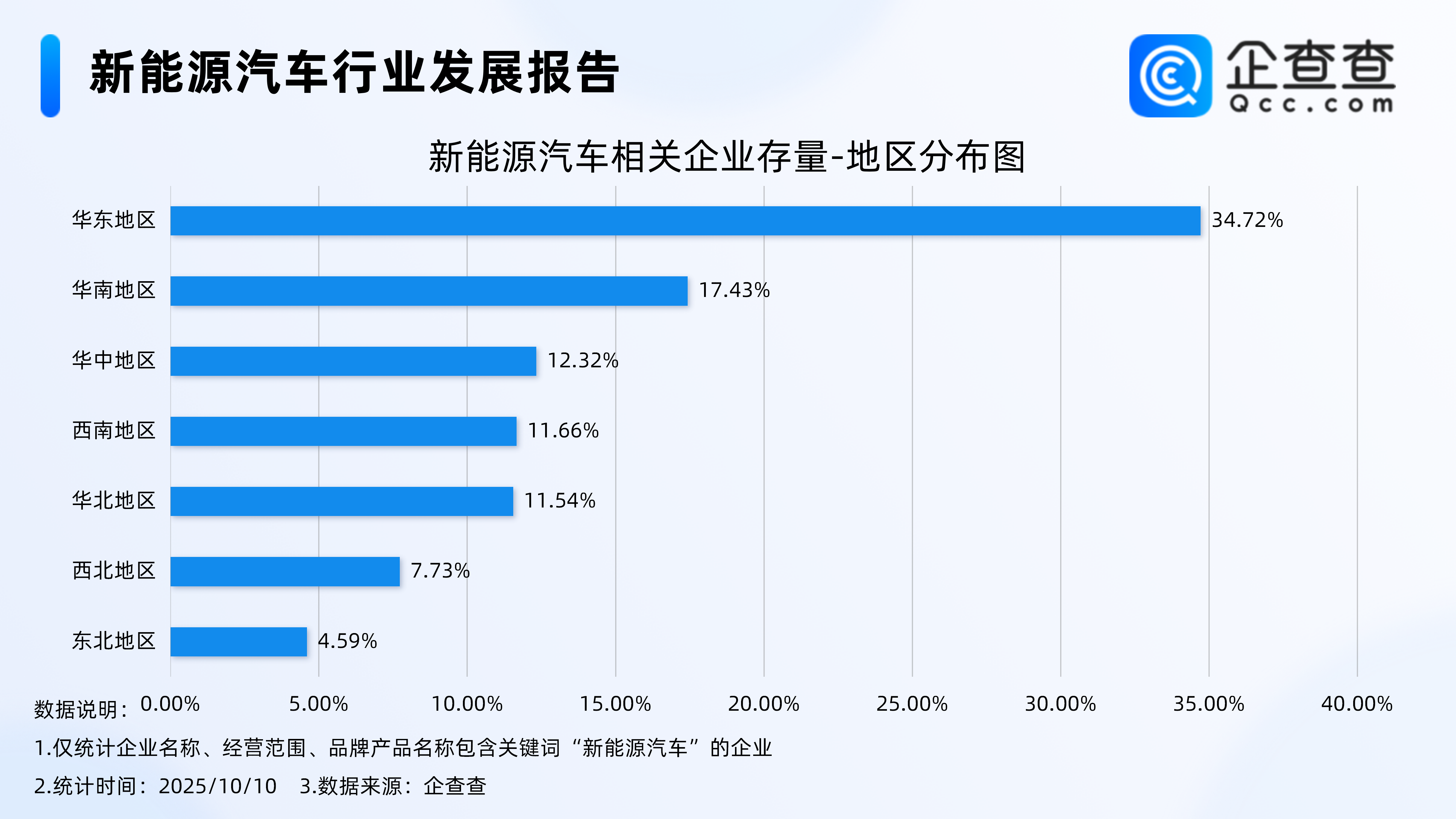 企查查数据显示,国内现存新能源汽车相关企业140.32万家。注册量方面,近十年相关企业注册量呈整体增长态势,2024年全年注册31.5万家相关企业,截至目前,今年已注册24.68万家相关企业,同比增长6.02%。存量方面,从经营时间来看,新能源汽车相关企业多成立于近三年,其中成立年限在1-3年的相关企业最多,占比36.02%。从地区分布来看,新能源汽车相关企业主要分布在华东地区,占比达34.72%。