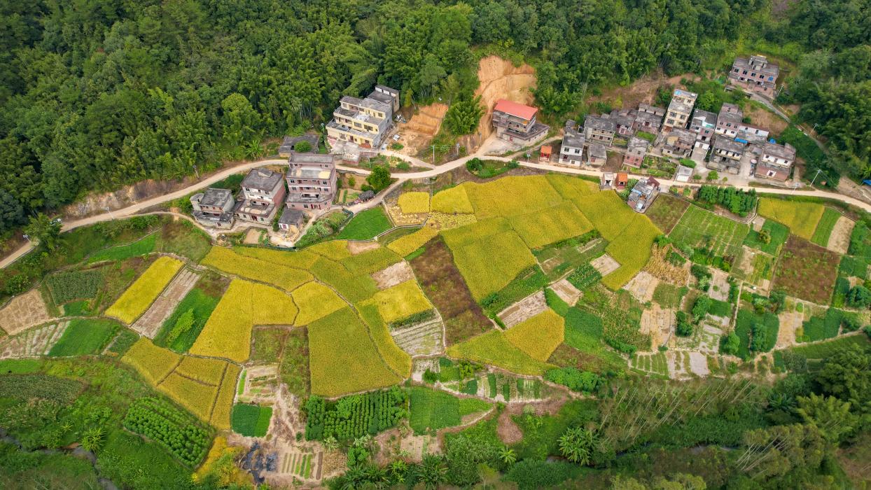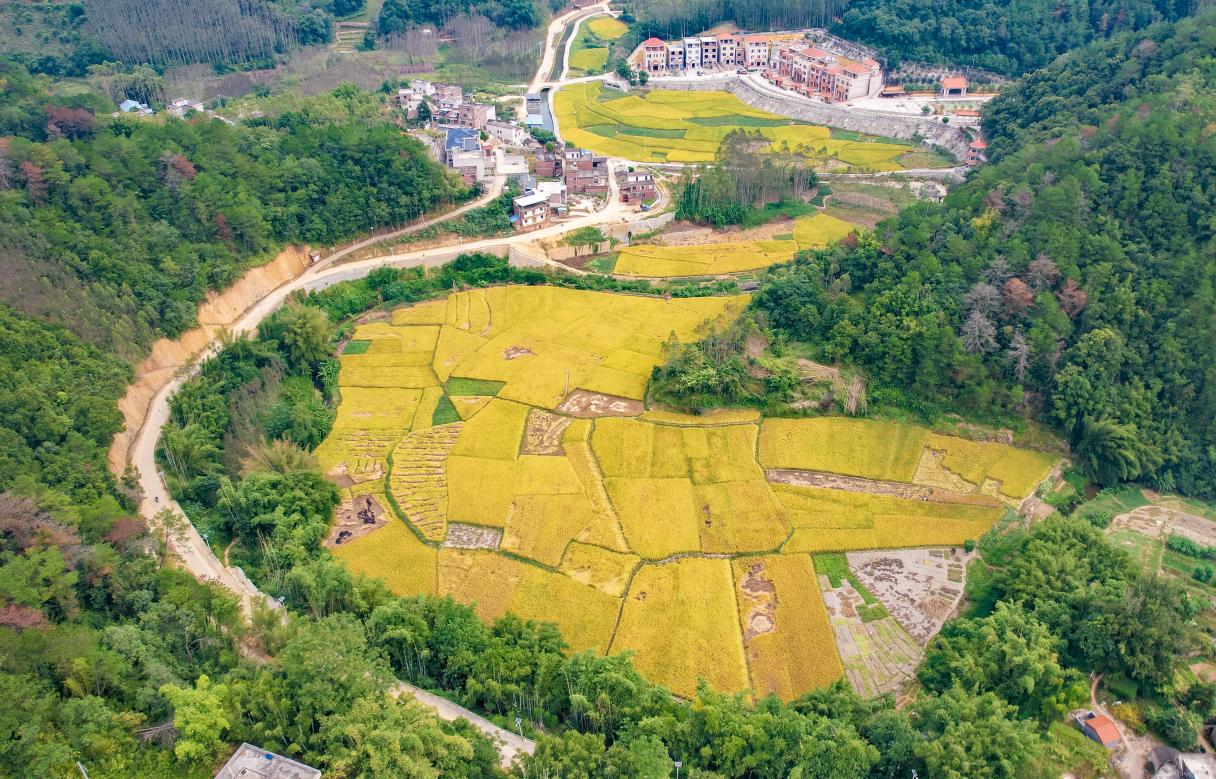 2025年10月27日,广西梧州苍梧县旺甫镇胜坡村,金黄稻田与青山河流、村庄、道路相互融合,一幅丰收图景徐徐展开。
