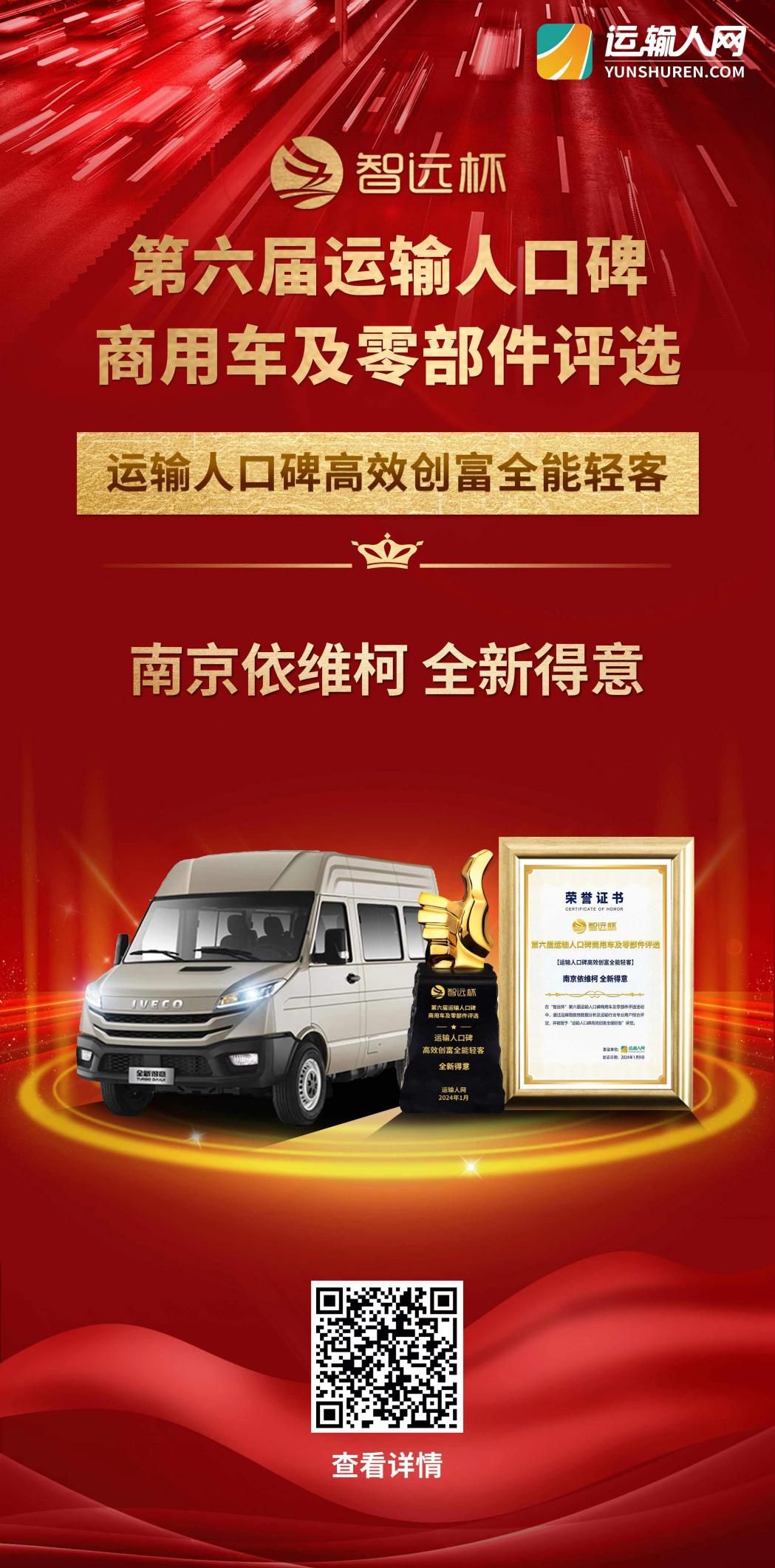 2024年1月,行业瞩目的“智远杯”第六届运输人口碑商用车及零部件评选活动隆重举办,依维柯得意凭借可靠品质和出色口碑脱颖而出,一举摘得““口碑高效创富全能轻客”奖项!