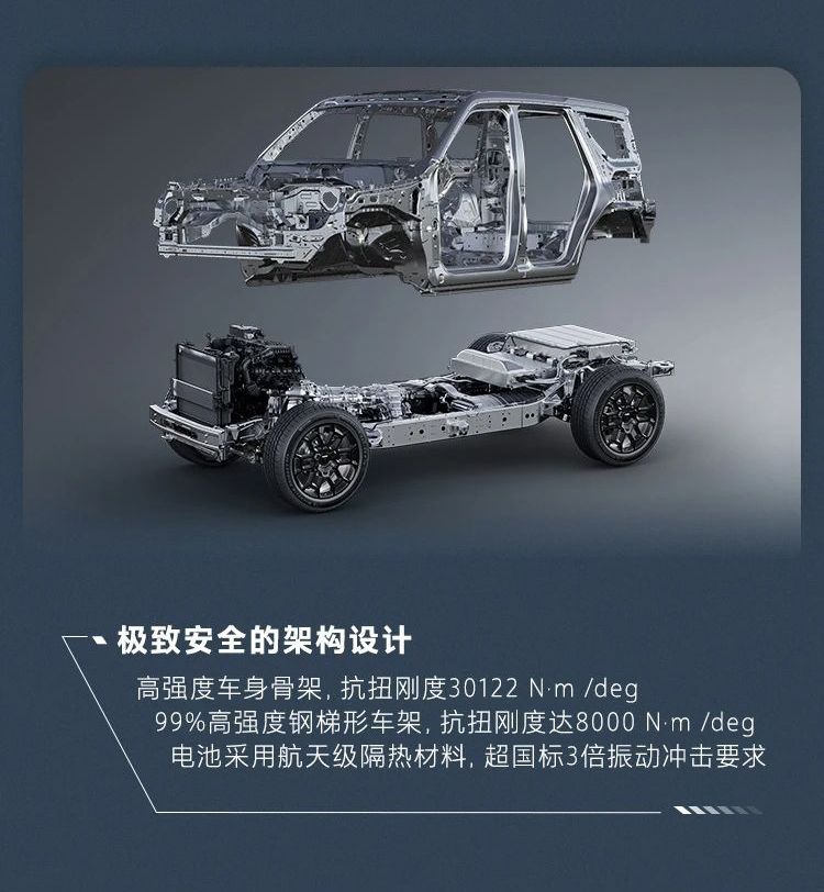 车架和车身骨架都采用了最顶级的材料,抗扭刚度30122N·m/deg,确保驾乘人员的安全无忧。