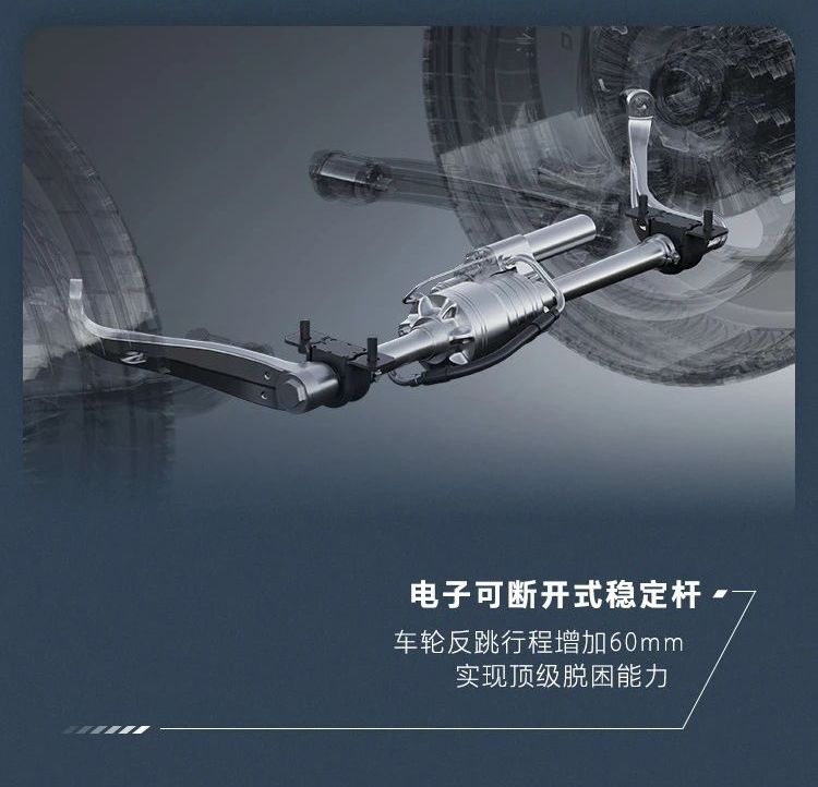 坦克700 Hi4-T搭配了新一代智能四驱系统+Mlock机械锁,适应性强,动力输出更顺畅。而“电子可断开式稳定杆”,则可以让坦克700 Hi4-T的车轮反跳行程增加60mm,实现顶级的脱困能力。