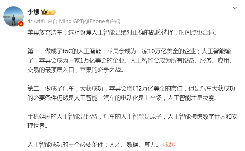 理想汽车CEO李想也发文称,苹果放弃造车,选择聚焦人工智能是绝对正确的战略选择,时间点也合适。