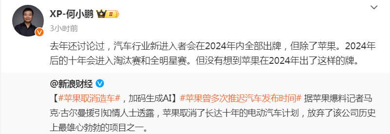 小鹏汽车董事长何小鹏表示,去年还讨论过,汽车行业新进入者会在2024年内全部出牌,但除了苹果。2024年后的十年会进入淘汰赛和全明星赛。但没有想到苹果在2024年出了这样的牌。