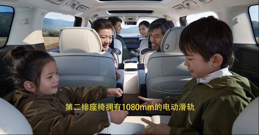 第二排座椅设计了1080mm长的电动滑轨,特别是170mm的第二排座椅间隙,即便是成年人也能轻松通过,不需要侧身和抬腿。